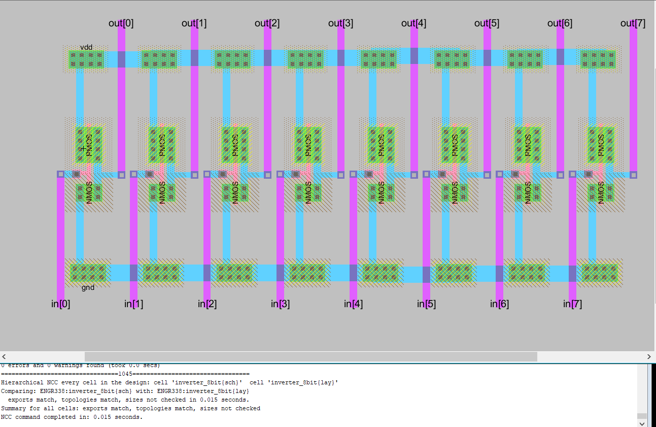 2: Shows the Layout of the 8-bit inverter with no DRC or NCC Errors