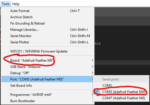 that under Tools>Port: COMx (Adafruit Feather M0) is showing up.