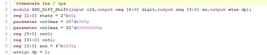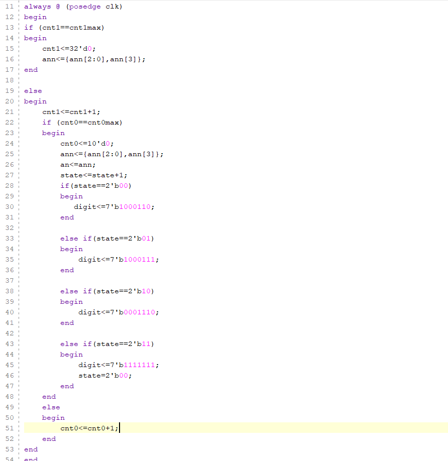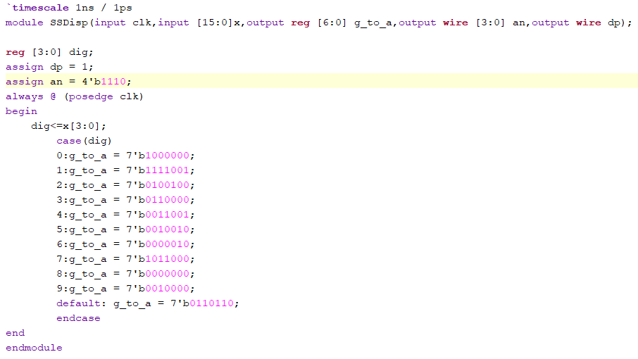 displays only one is needed. This was done simply by changing the an value from 4'b0000 to 4'b1110. Figure 11: Seven-segment single display code.