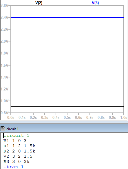 Figure 2: Voltage simulation values and spice code for superposition circuit.