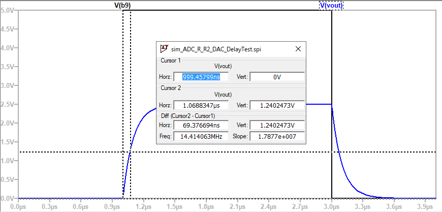 hand calculation: time delay = 0.7RC = 0.7 * 10k * 10p = 70ns