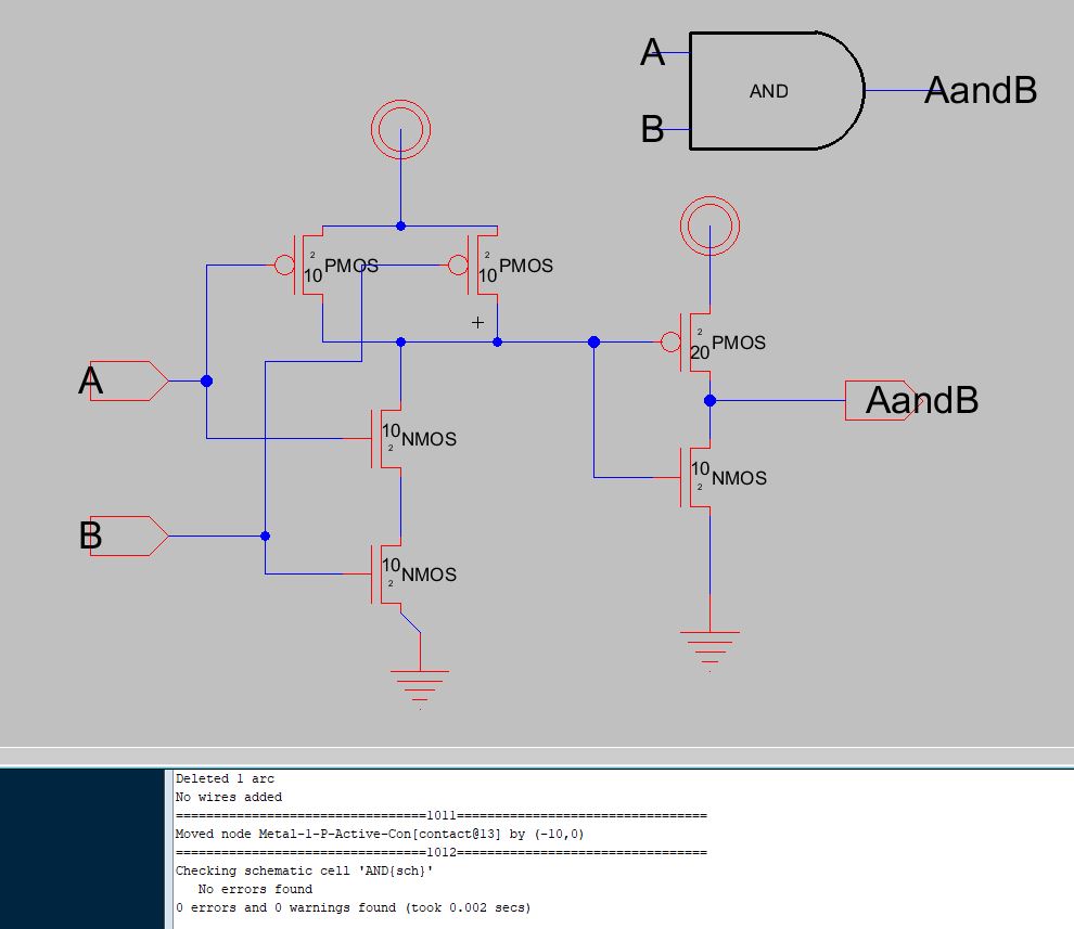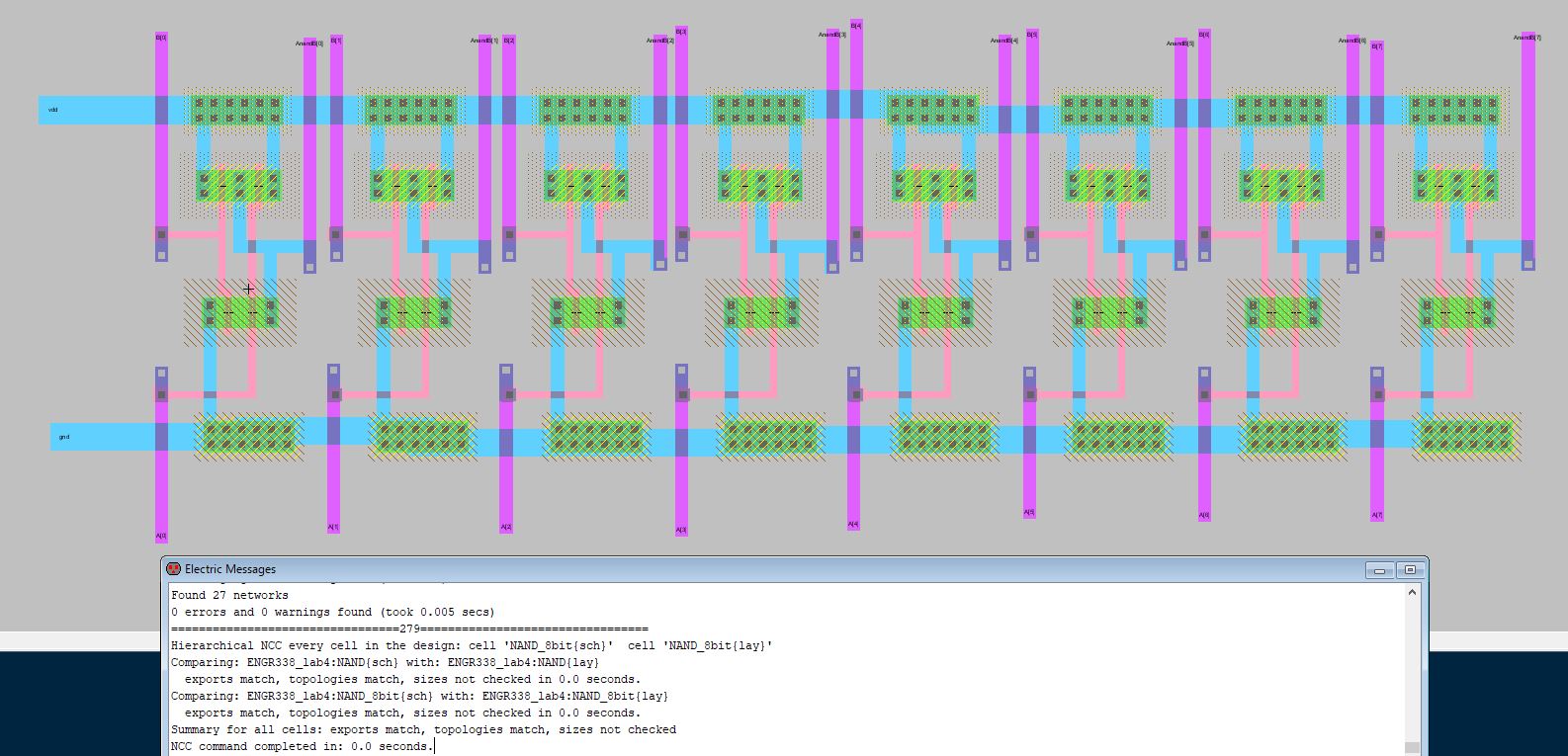 logic. A layout was also created using 8 of the previously made AND layouts to create the multi-bit gate. DRC and NCC checks were run throughout the process.