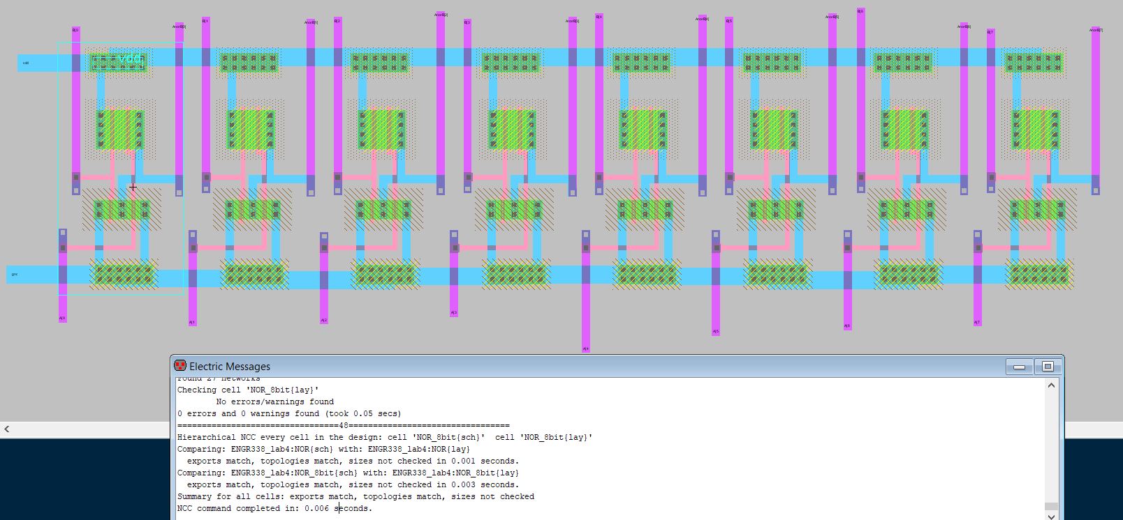 An 8-bit NOR gate was designed using the previously made NOR gate and buses. A layout was also created using 8 of the previously made NOR layouts to create the multi-bit gate. The NOR logic was simulated and verified using LTSpice. DRC