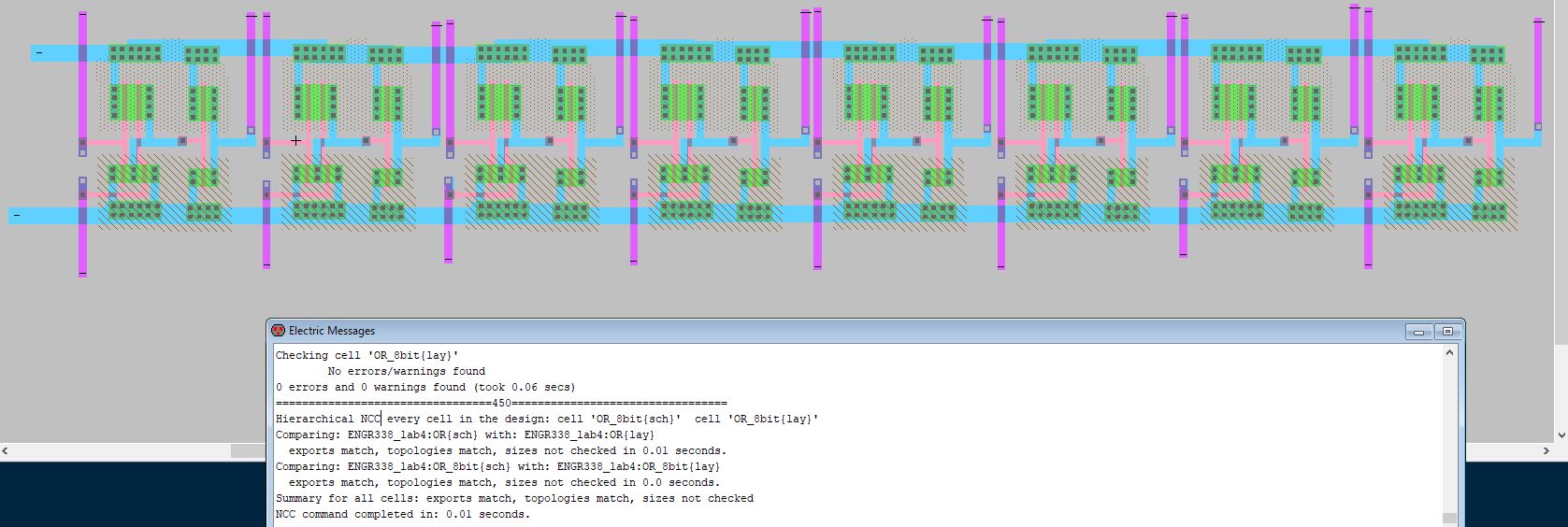 logic. A layout was also created using 8 of the previously made OR layouts to create the multi-bit gate. DRC