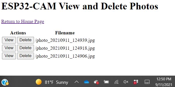 Figure 6. Webserver displaying a list of images previously taken and you can delete or view them.