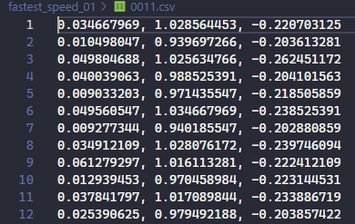 Figure 4. An example of the acclerometer data being recored to each CSV file.