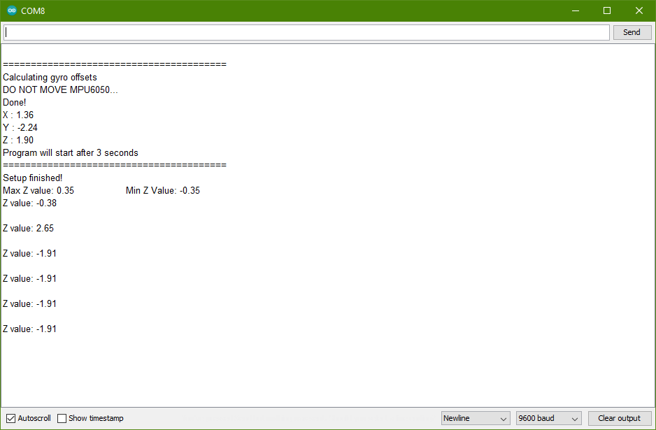 Figure 5. Screenshot of the serial monitor when using the vibration detector.