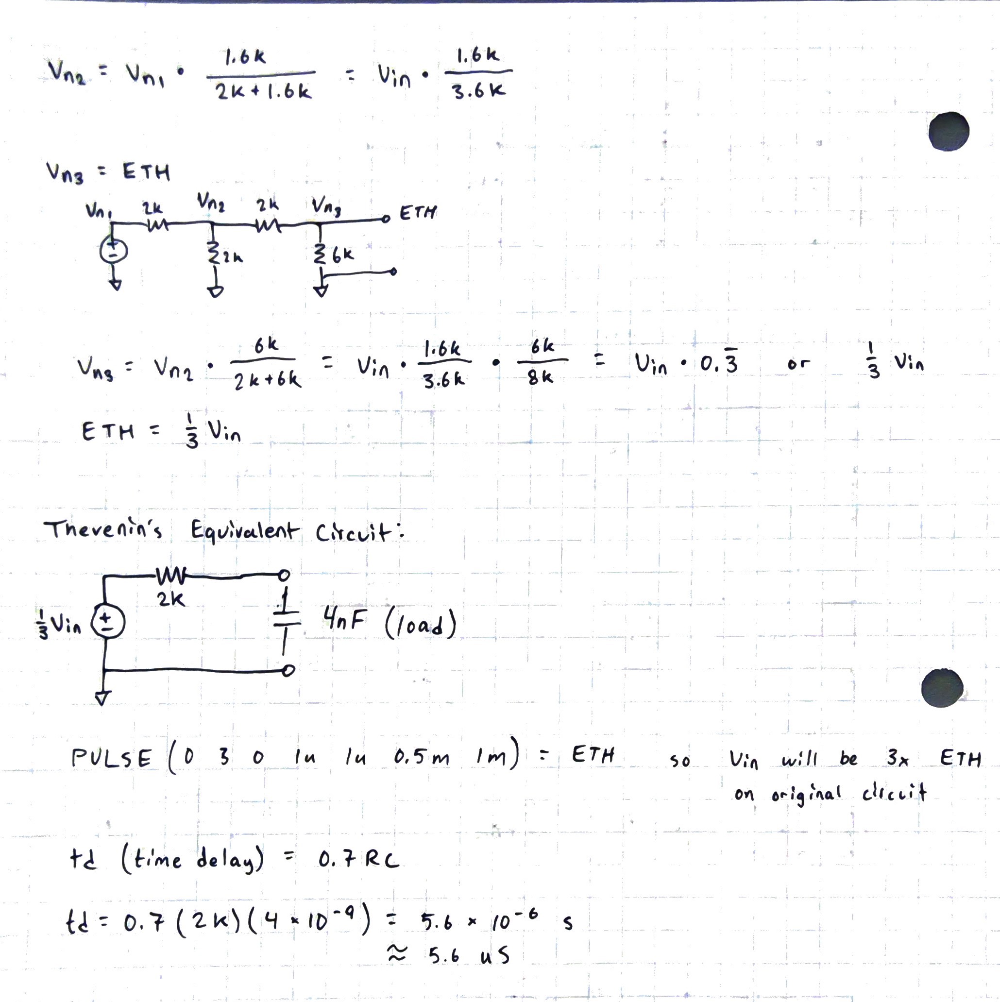 Figure 10: Calculations for finding Thevenin's equivalent voltage and the time delay of the circuit.