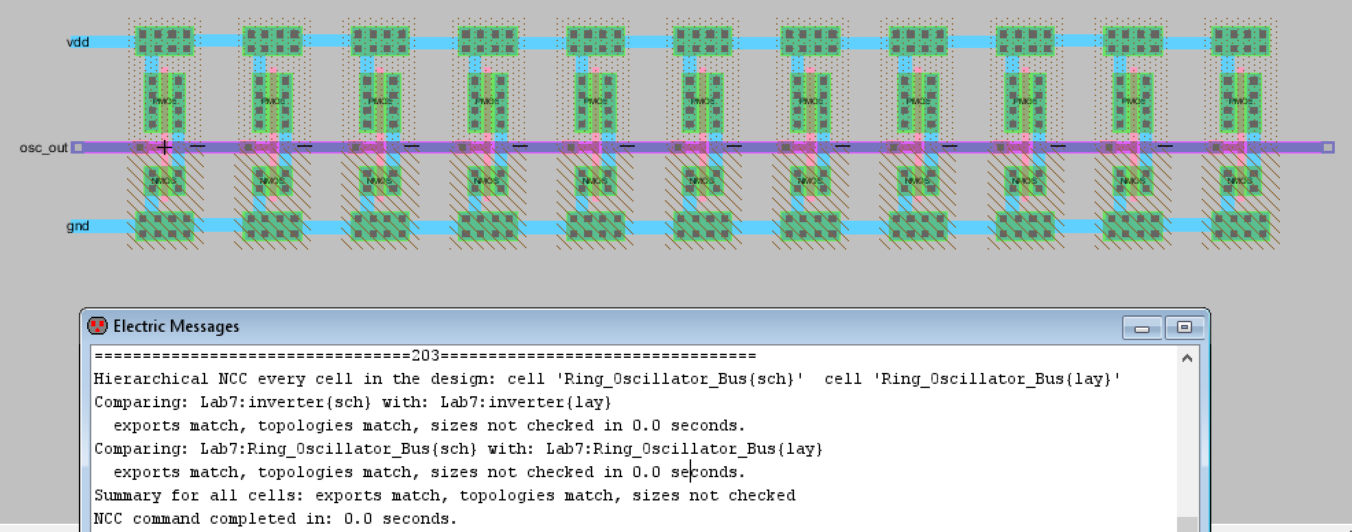 Figure 7. The completed ring oscillator bus schematic with NCC check results.