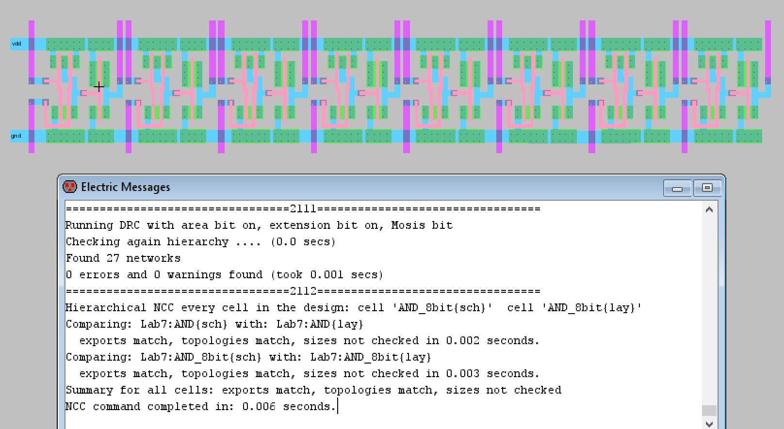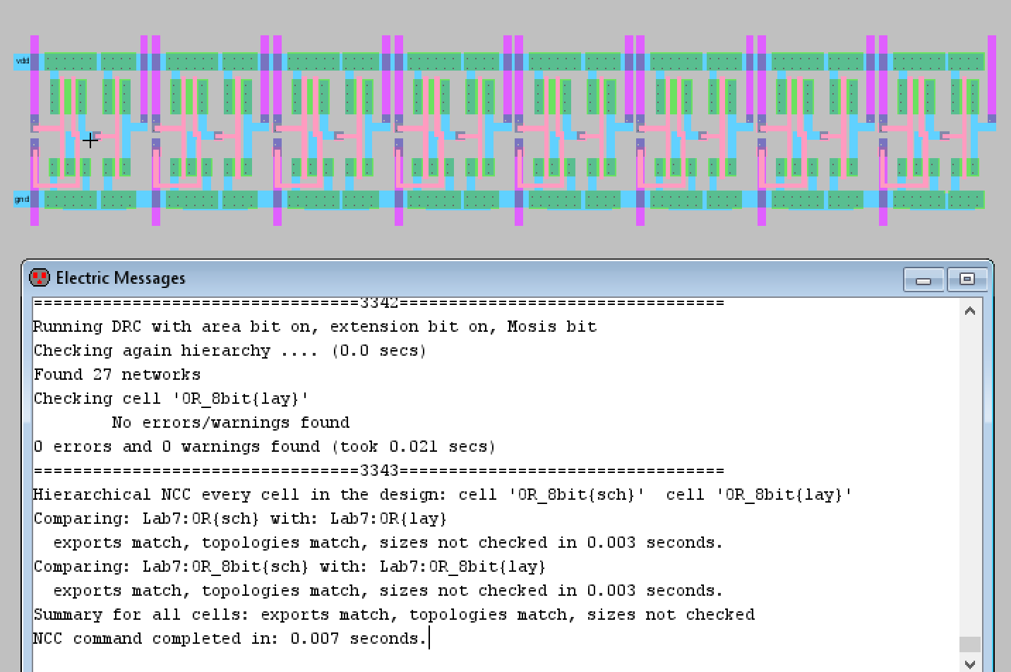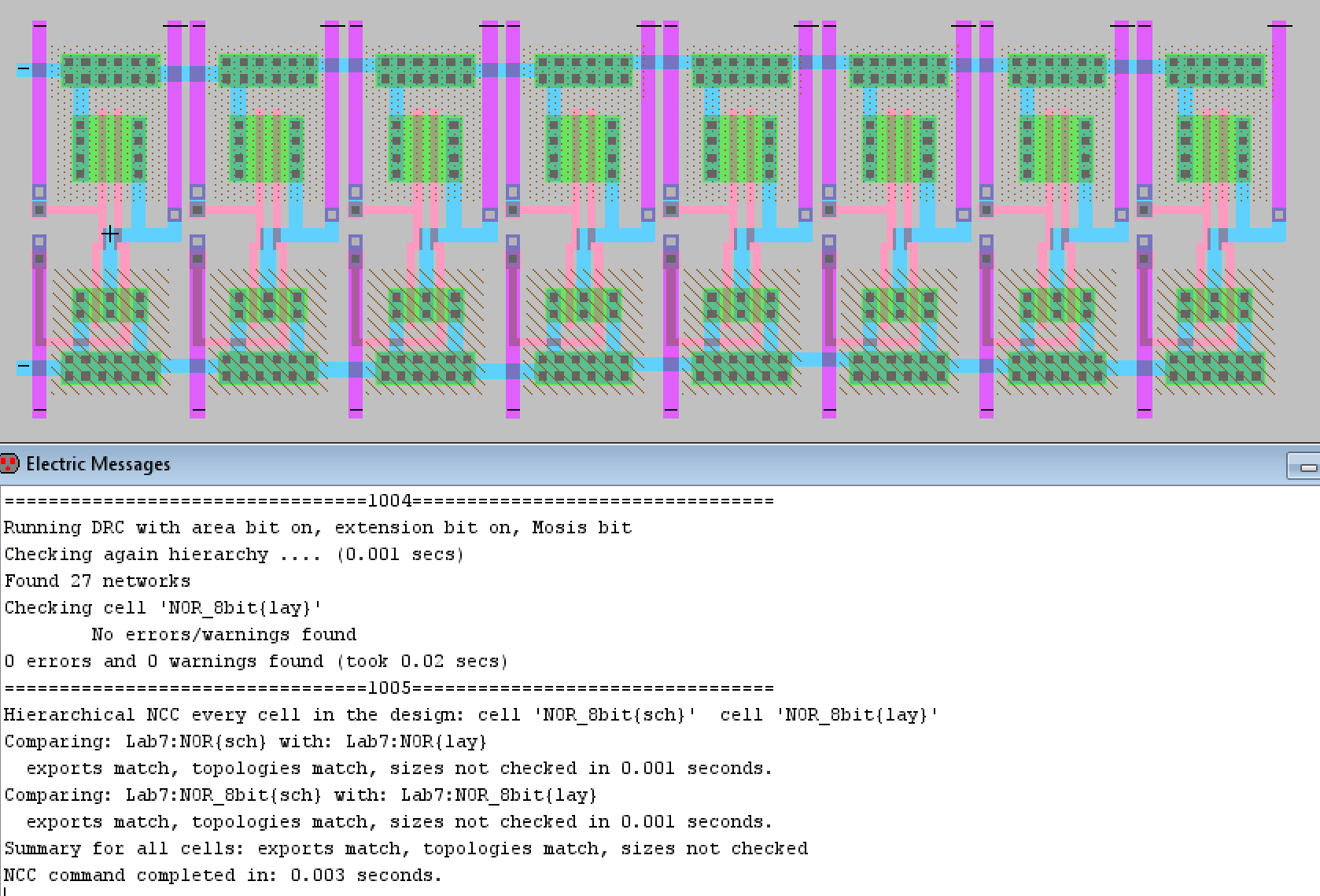 Figure 35. Final layout view for the 8-bit NOR gate with good DRC and NCC check results displayed.