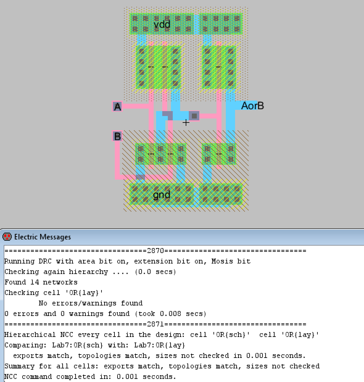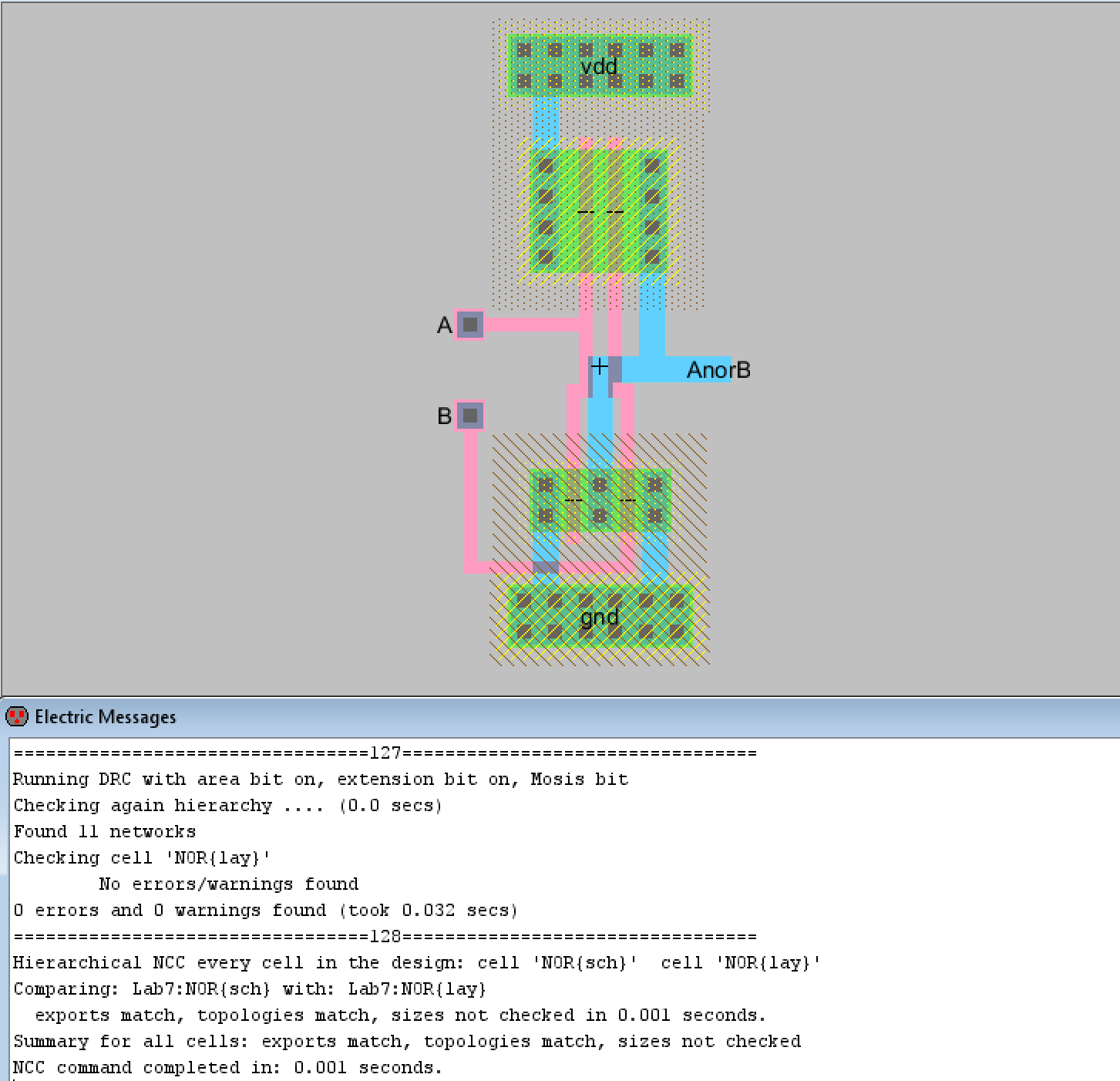 Figure 31. Layout view of the individual NOR gate with good DRC and NCC check results shown.