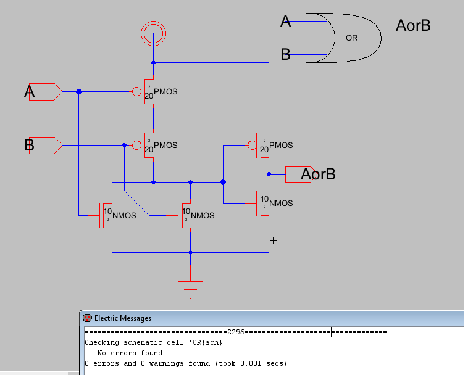 Figure 14. Schematic, icon, and DRC check results for my OR gate.