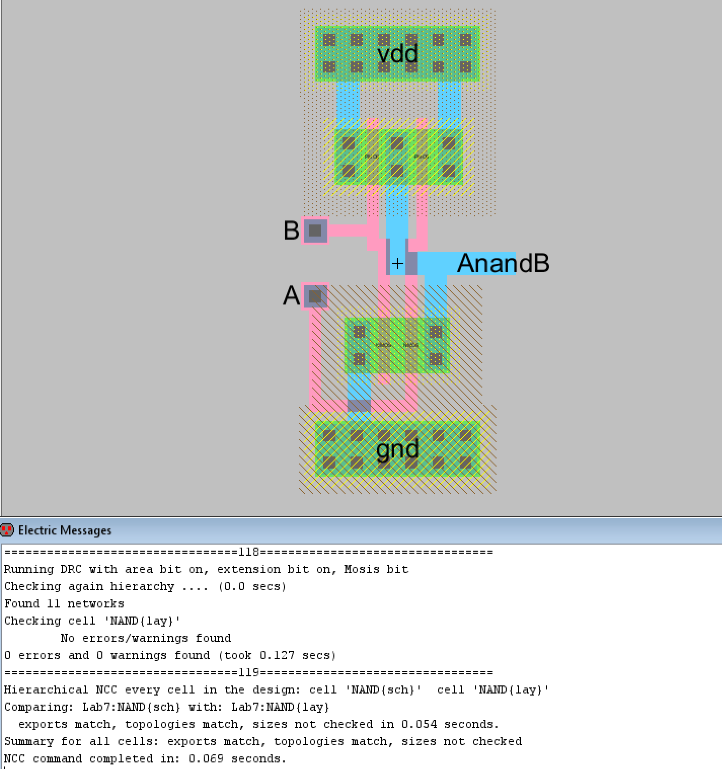 After this I created the layout view for the individual NAND gate and made sure it passed DRC and NCC checks.