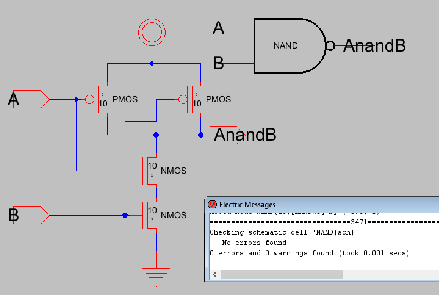 Figure 23. Schematic, icon, and DRC check results for the NAND gate.