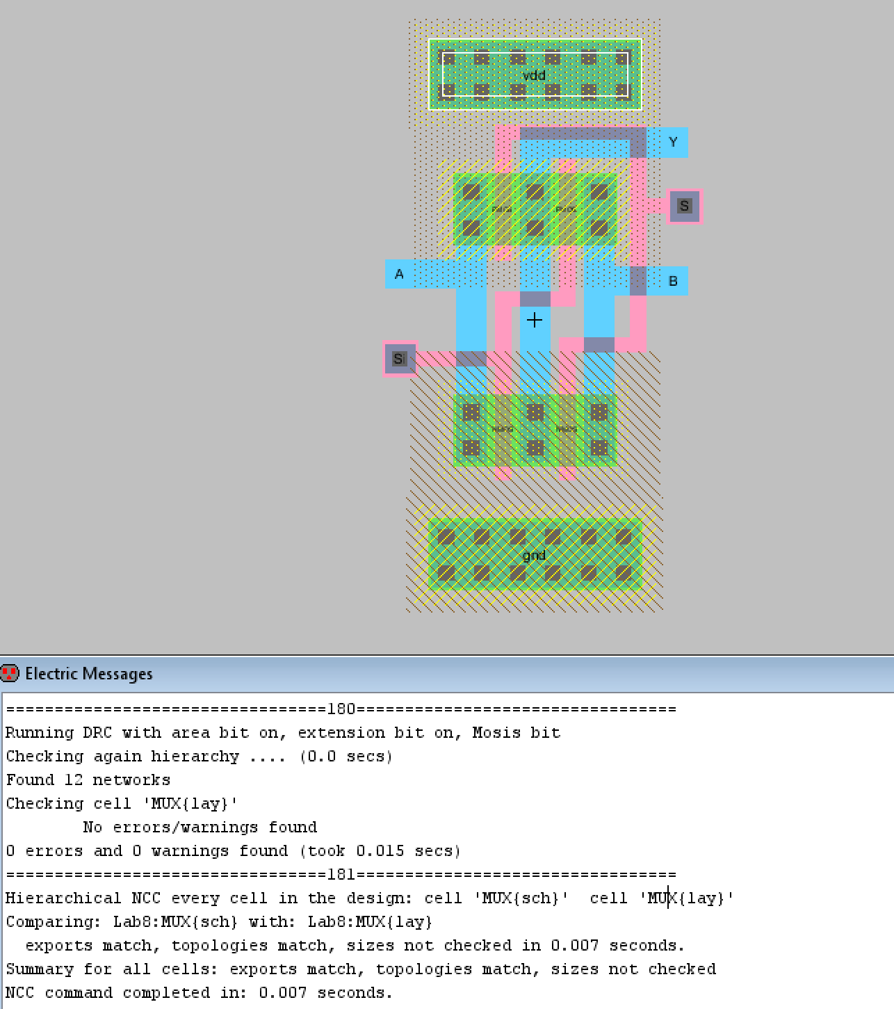 Figure 7. Final layout view for the 2-1 MUX. DRC and NCC check results