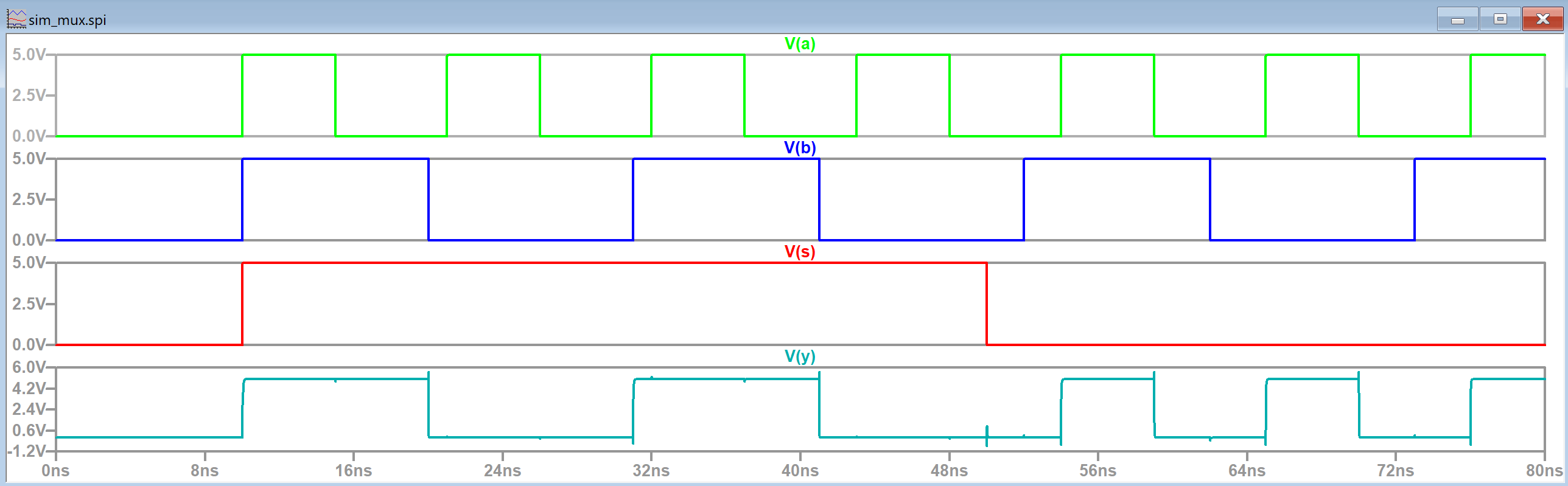Figure 3. LTSpice simulation waveform results for the 2-1 MUX. V(y)