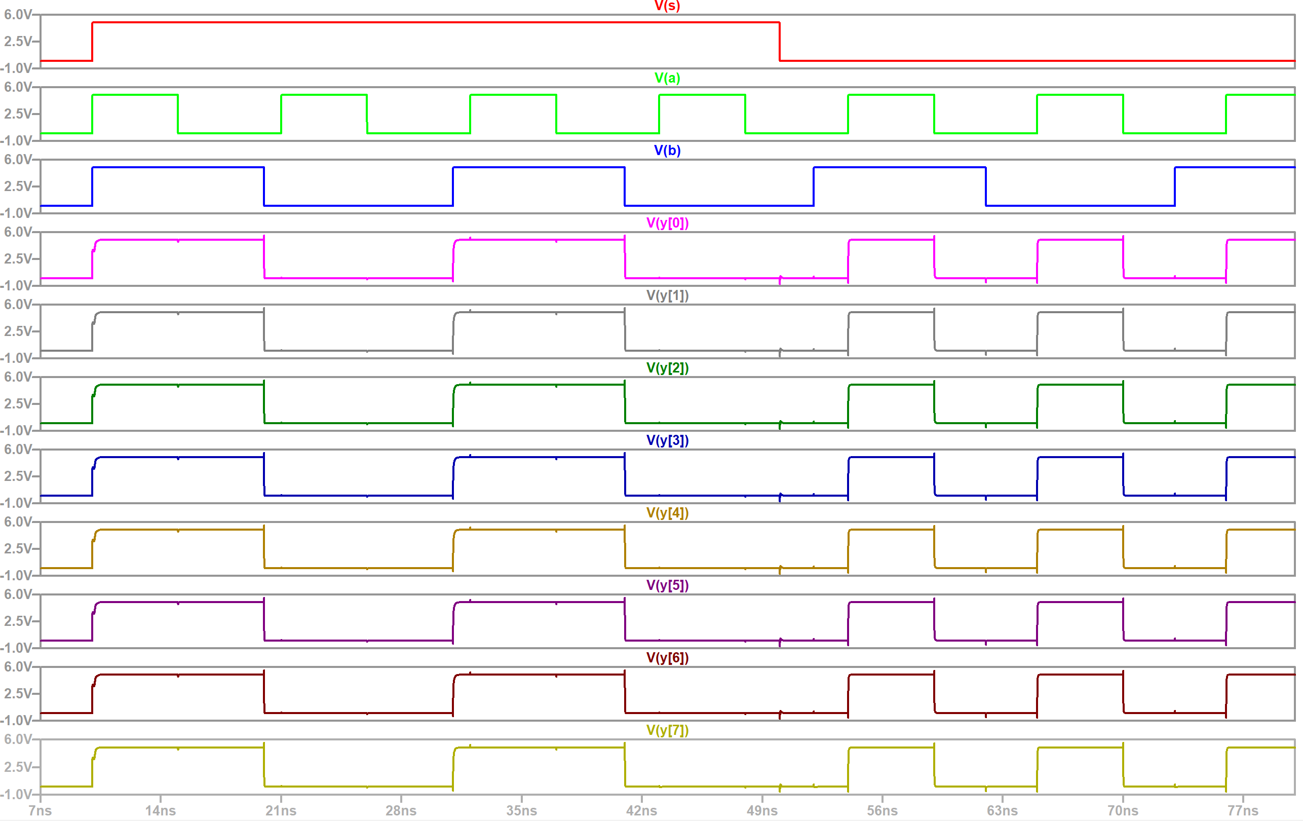 Figure 6. LTSpice simulation waveform plot for the 8-bit MUX. V(y[0:7])