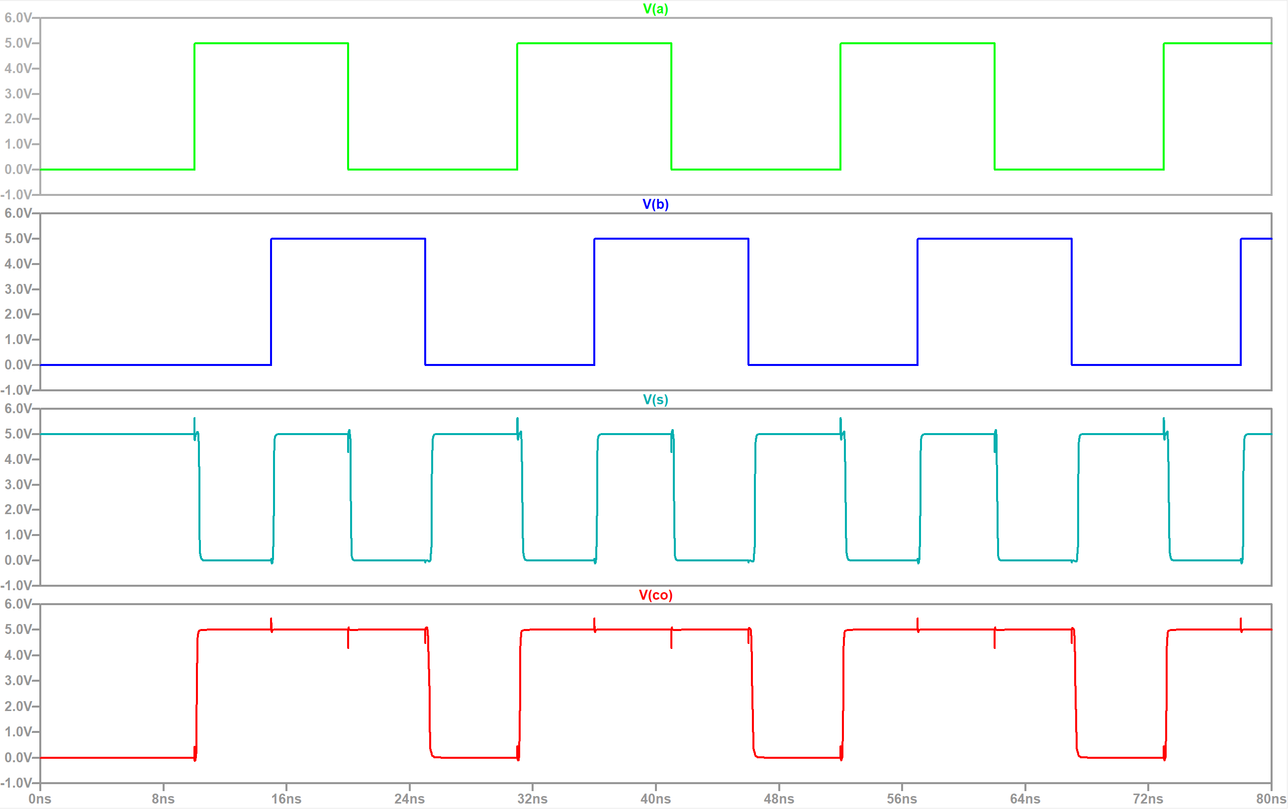 Figure 12. LTSpice simulation waveform plots of the A and B inputs with S and Co outputs.