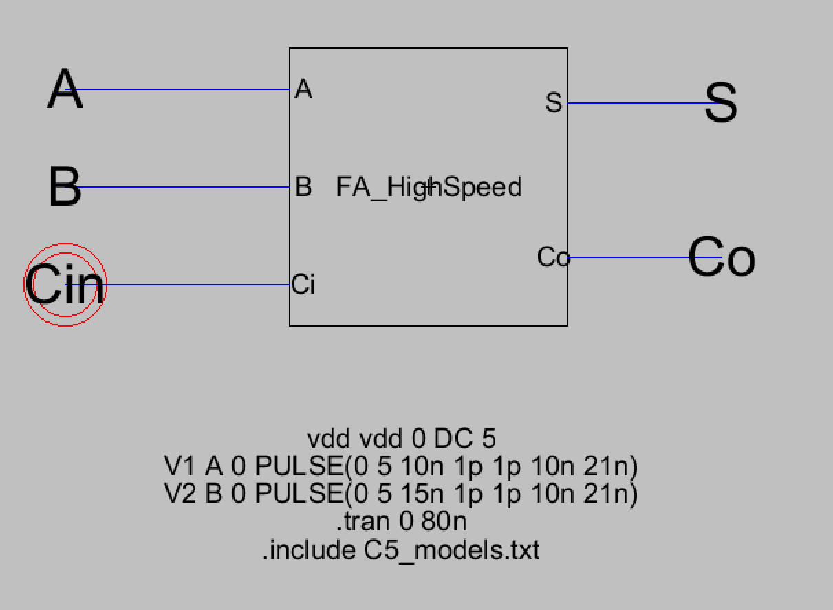 Figure 11. Simulation schematic for the 1-bit high-speed full adder with its spice code.
