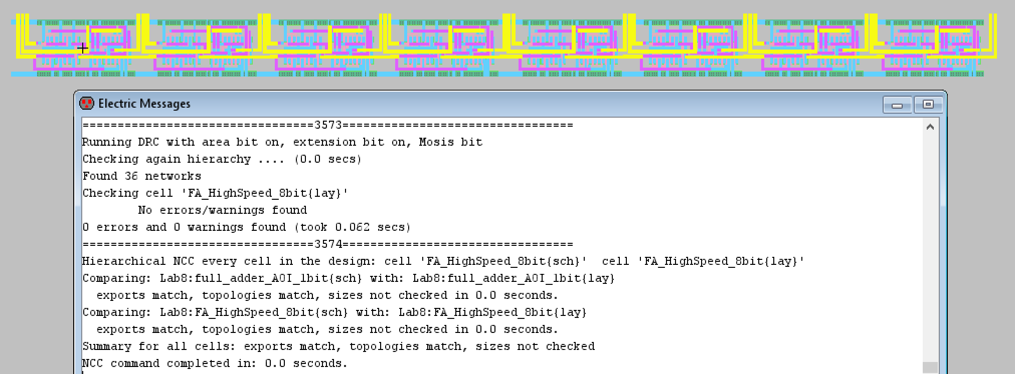 Figure 19. Final layout view of the 8-bit full adder along with good DRC and NCC check results.