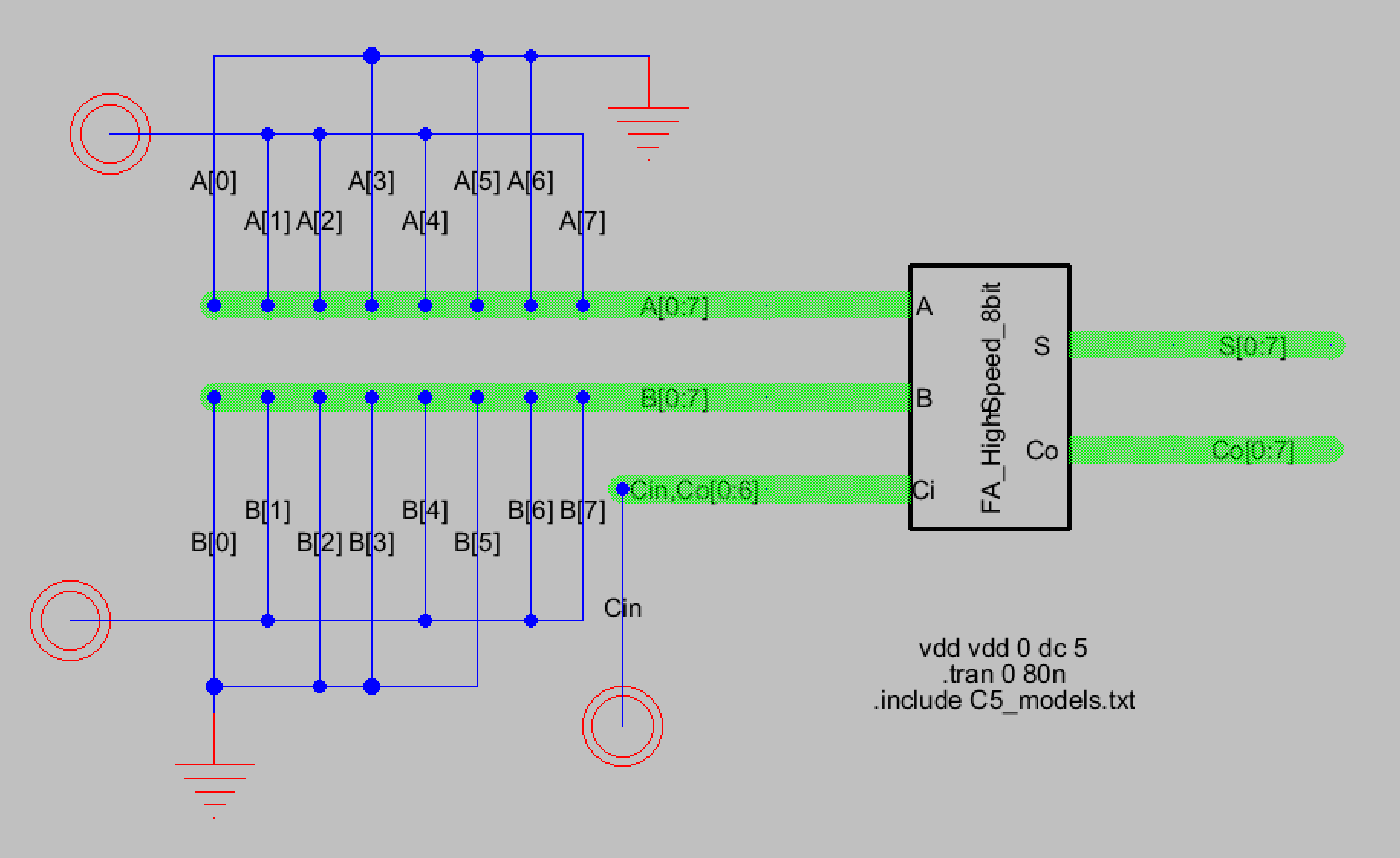 Figure 18. Simulation schematic for the third simulation. A = 1001 0110, B = 1101 0010, Cin = 1.