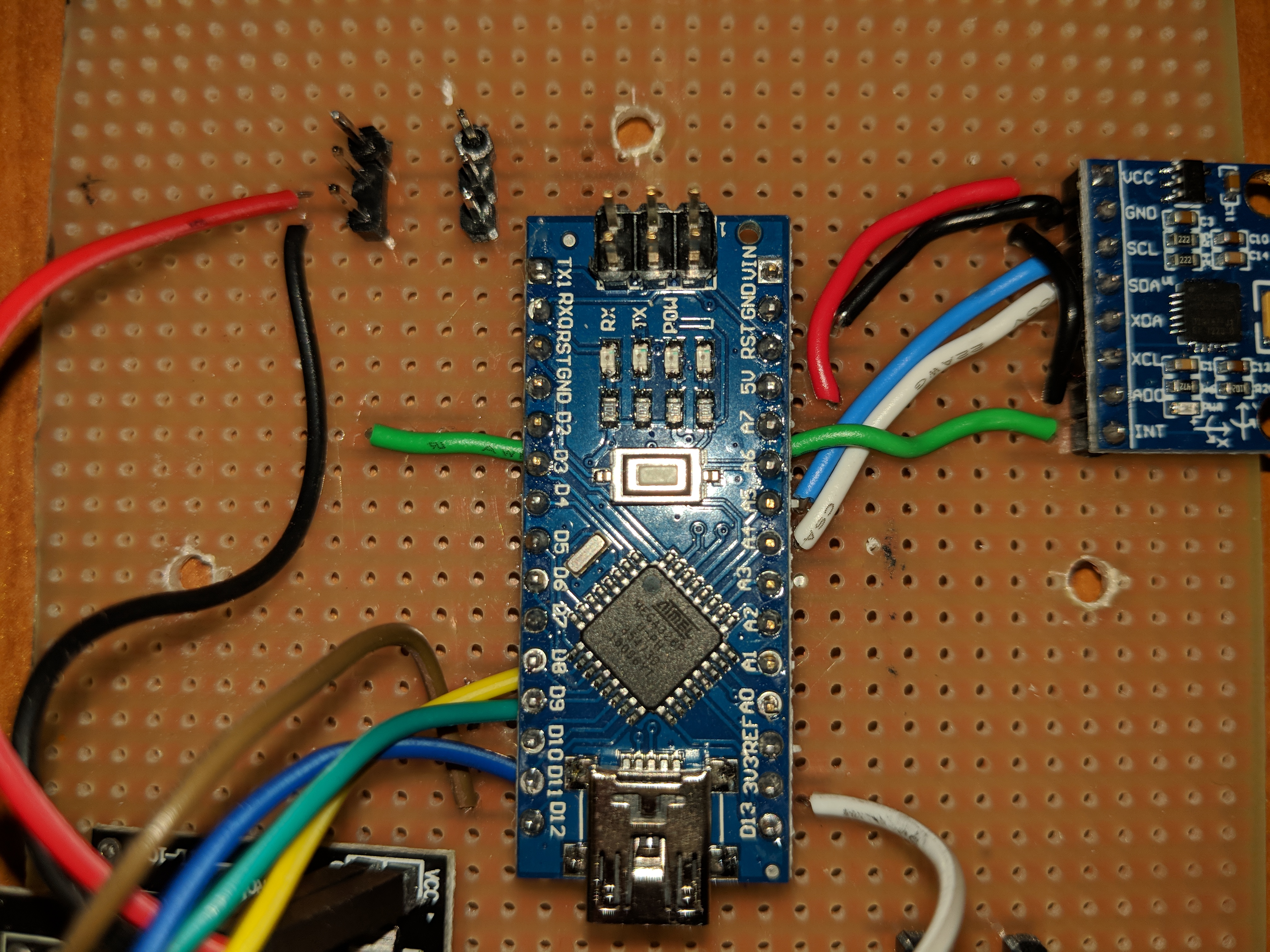 The Arduino Nano gets powered by drone's 11.1V lithium polymer battery.
