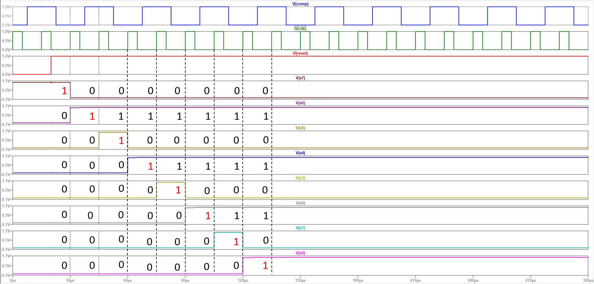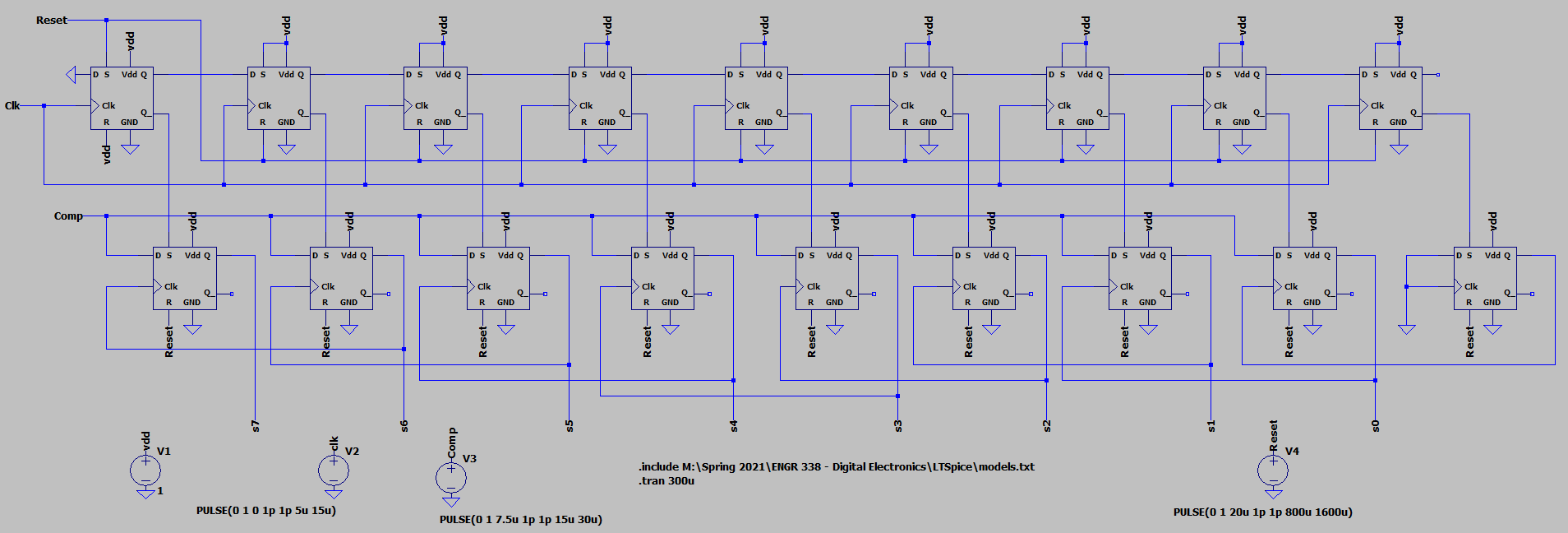 4-bit SAR ADC schematic. The schematic took on a row/column-structure with five TI DFFs on top and bottom. The bottom set acted as a sequencer and the top as a shift register. This structure can be seen in LTSpice in Figure 7.