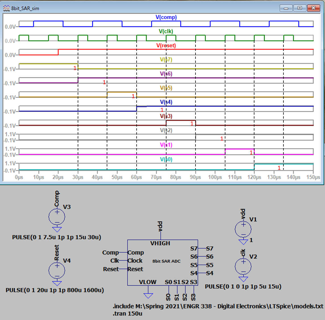 Figure 11. 8-bit SAR ADC Symbol schematic with waveform to prove the correct logic