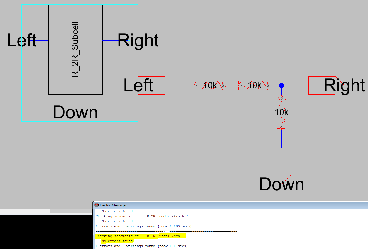 Once the components from the Subcell group was done, R_2R_Ladder_V2 was created from those components. Both schematic and icon for the new ladder can be seen in the following figure. This is also where Task 1 ended.