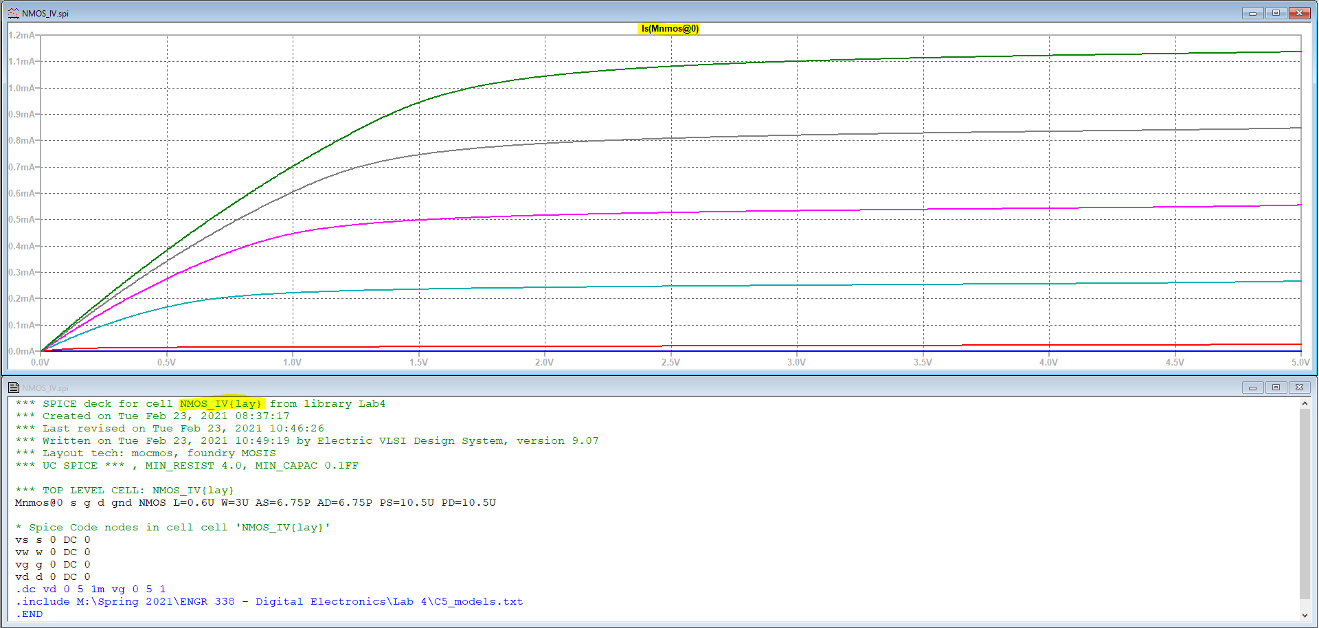 Figure 4. NMOS_IV{lay} LTSpice waveform results from "Is" probed
