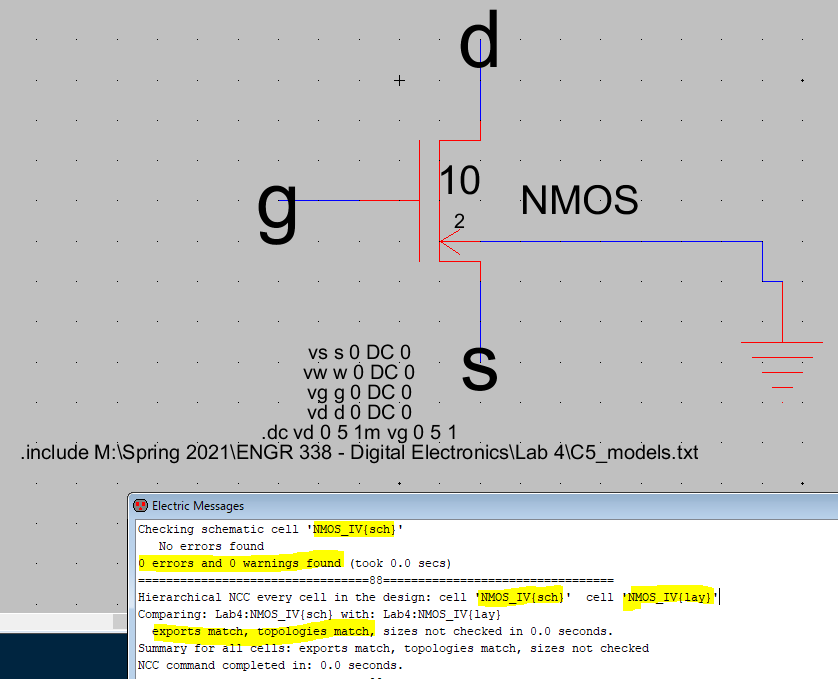 Figure 2. NMOS_IV{lay} final design with LTSpice code and ERC scan passed
