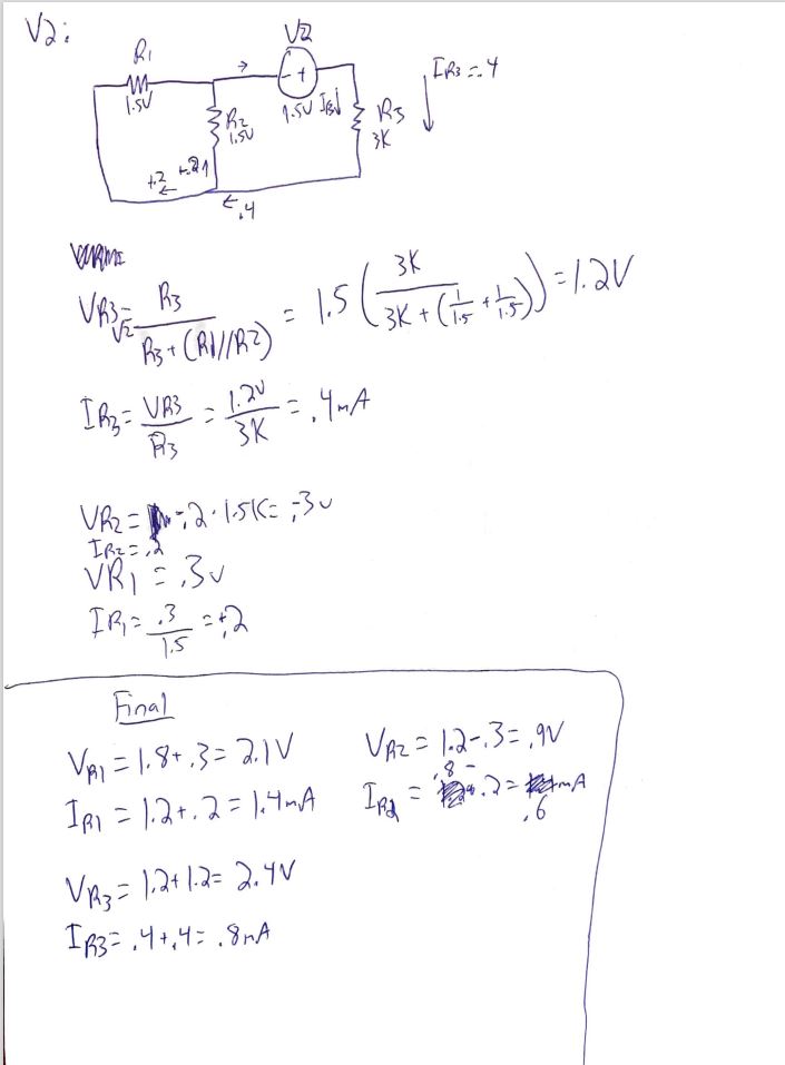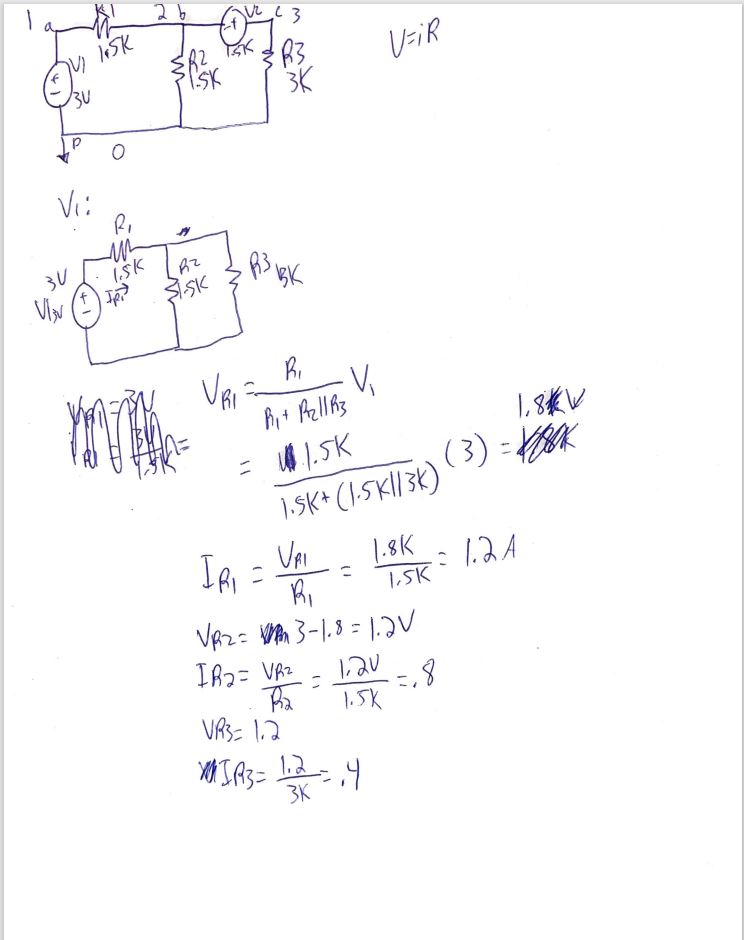 Here are my hand calculations to find the voltage and current for r1,r2, and r3 using super position.