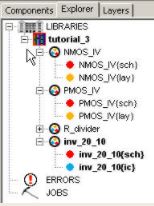 inverter_sim with a layout view. In the Explorer Drag inv_20_10{lay}