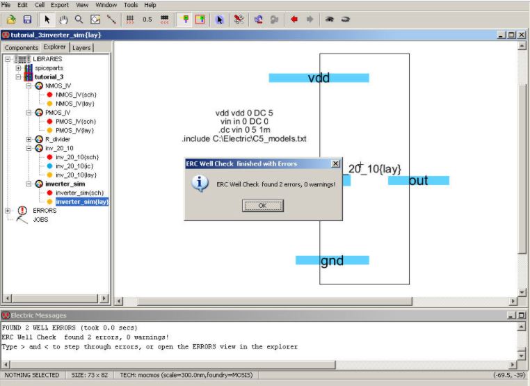 the cell inverter_sim. We get errors for both the NCC and the Well