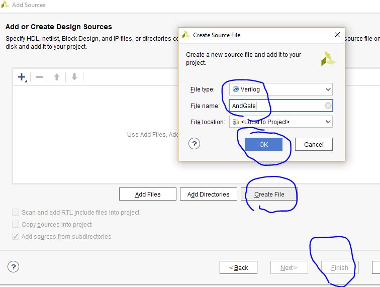 6.3 Create your first Verilog file, give it a name, and click 'Finish'.