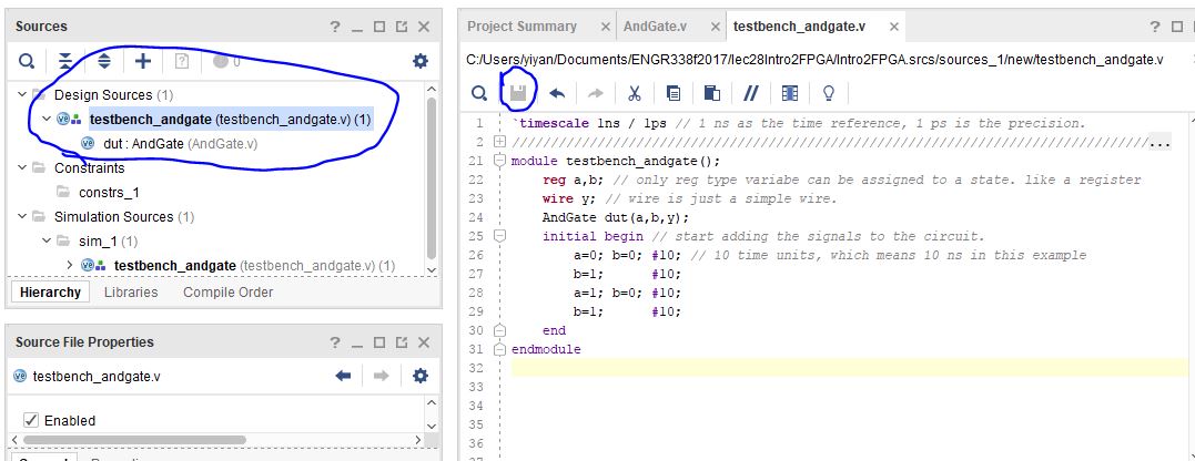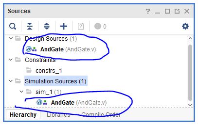 6.6. Double click 'AndGate.v' in the 'Design Sources' dropdown menu,