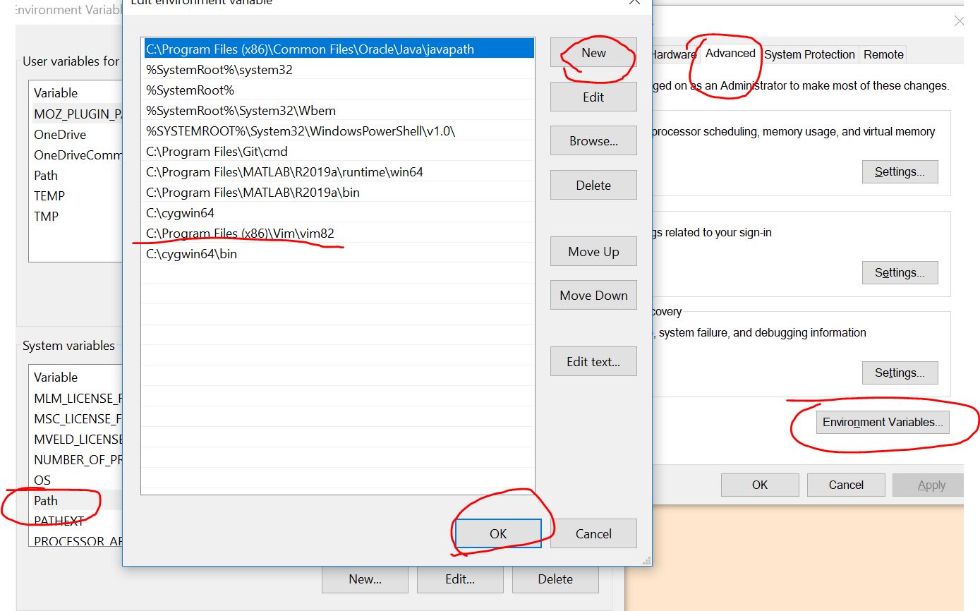 Click "Environmental Variables" - "Path" - Edit - "New" - Add the path to the directory of GVim on your computer:
