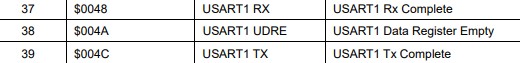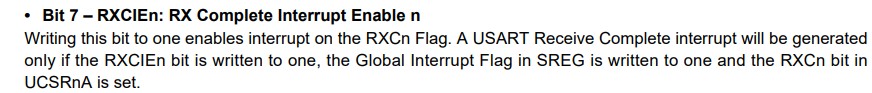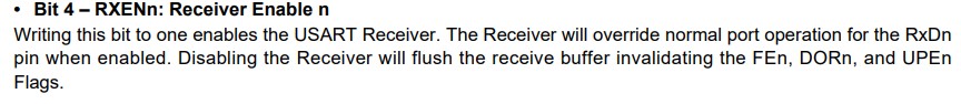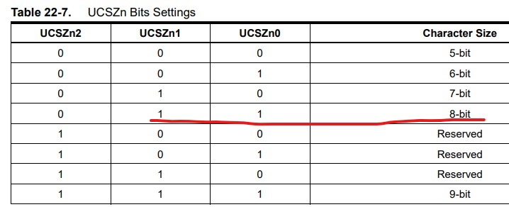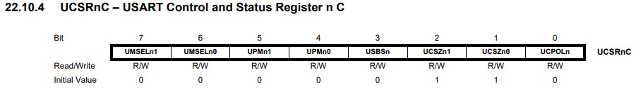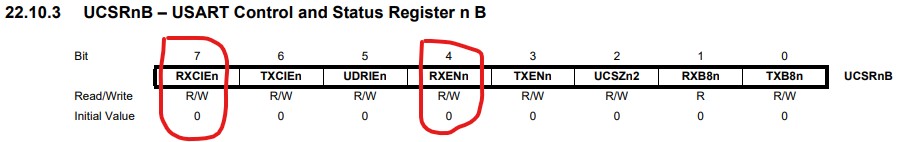 UBRR1H = BAUD_VALUE >> 8; UBRR1L = BAUD_VALUE; // Enable receiver, transmitter, and RX Complete interrupt UCSR1B = (1 << RXEN1) | (1 << RXCIE1); // Set frame format: 8 data bits, no parity, 1 stop bit UCSR1C = (1 << UCSZ10) | (1 << UCSZ11);