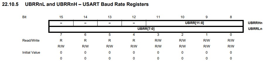 lower 4 bits of UBRRHn and the entire byte of UBRRLn are used.