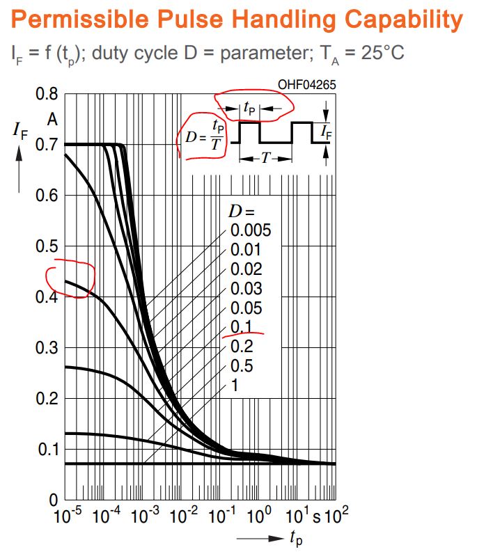 From the following diagram, you can find the maximum permissible current when the duty cycle is 10% or 0.1.