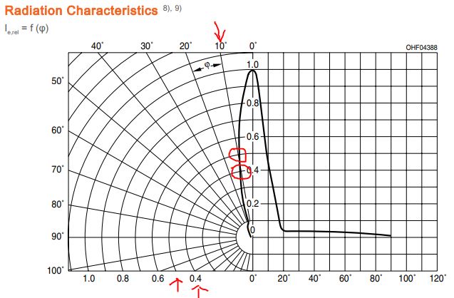 Radiant intensity map. What is the Relative Radiant Intensity of light emitted by the LED when viewed 10° off center?