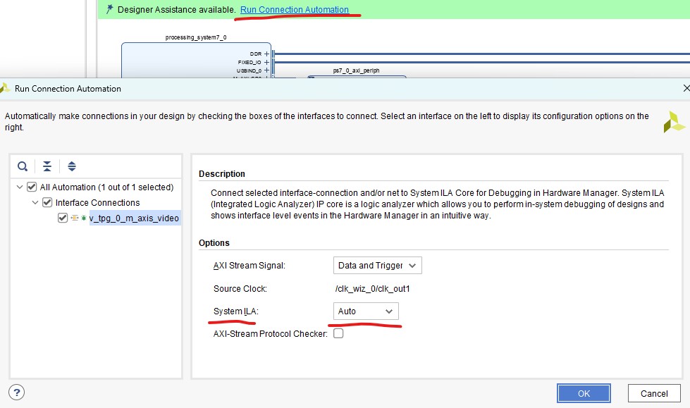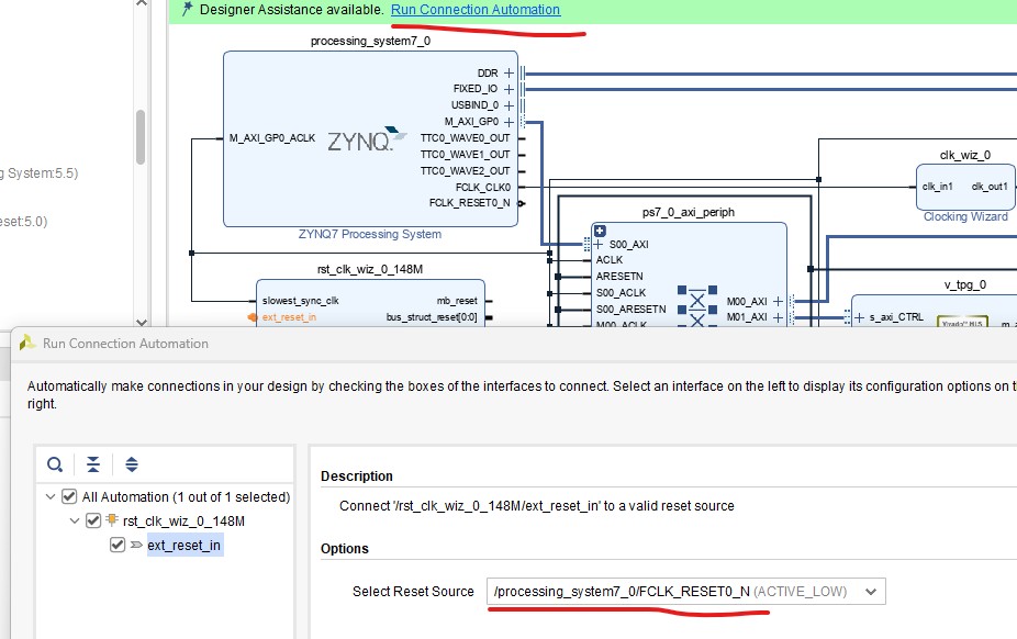 Use 'Run Connection Automation' to add an extra connection between FCLK_RESET0_N to ext_reset_in.