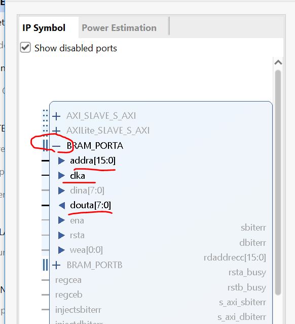 ports 'addra[15:0]', 'clka', and 'douta[7:0]'.