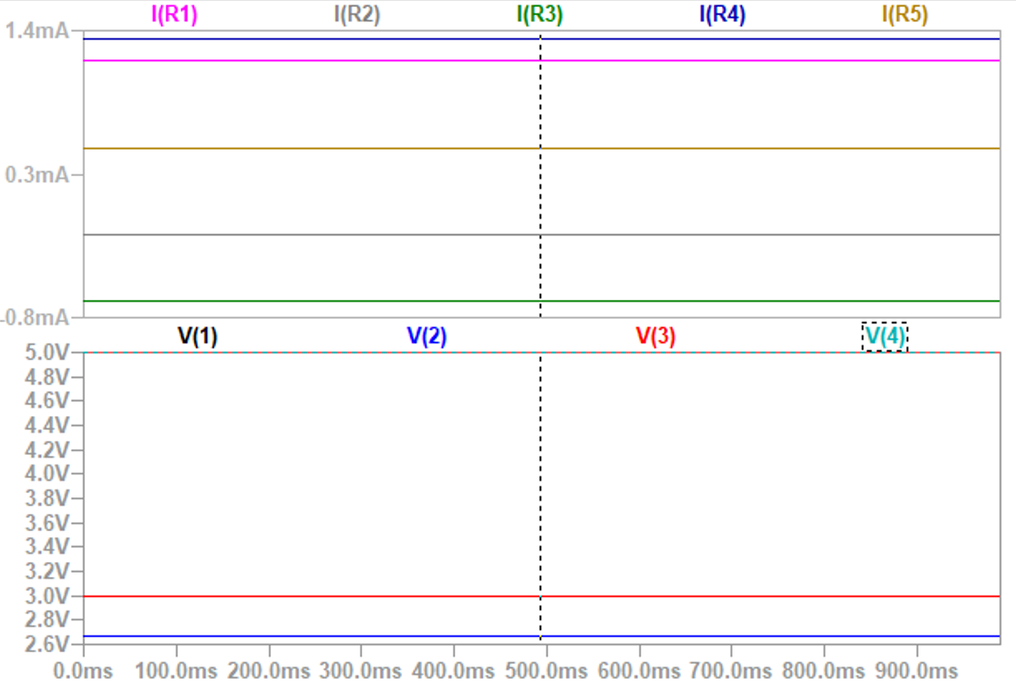 4 is simulated in LTspice; the voltage at each node and current through